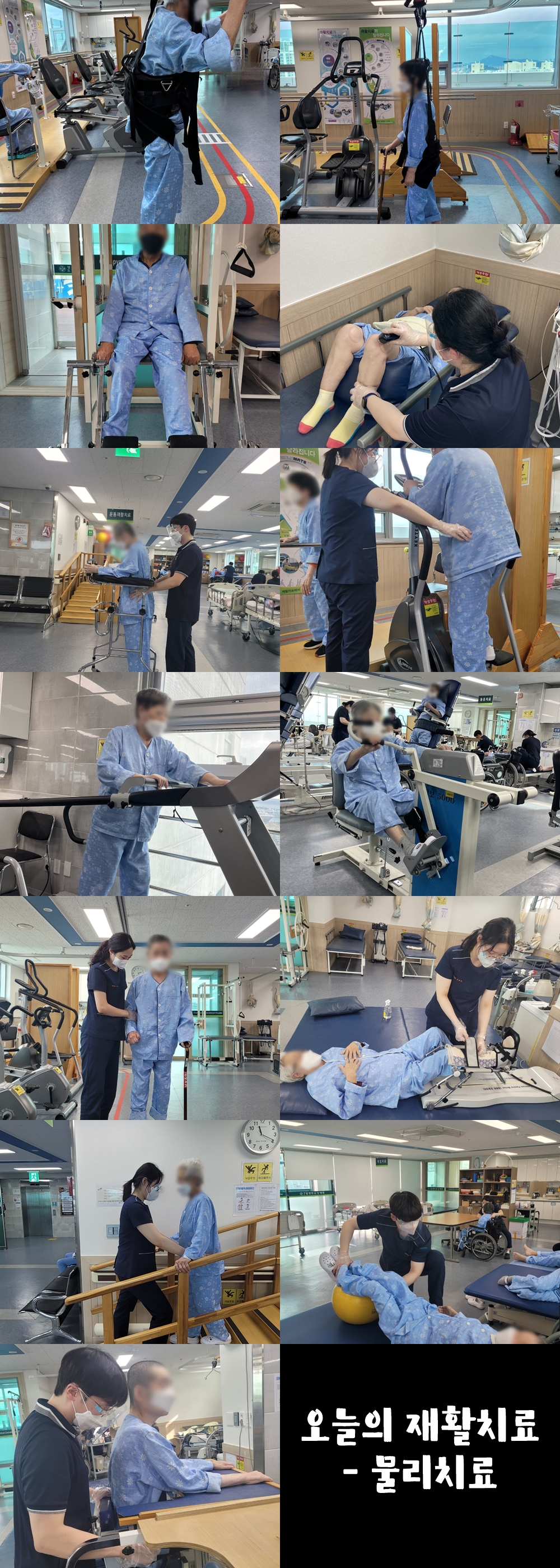오늘도 재활치료실에서는 재활운동치료, 매트 및 이동치료, 보행훈련 등 다양한 물리치료를 하였습니다.