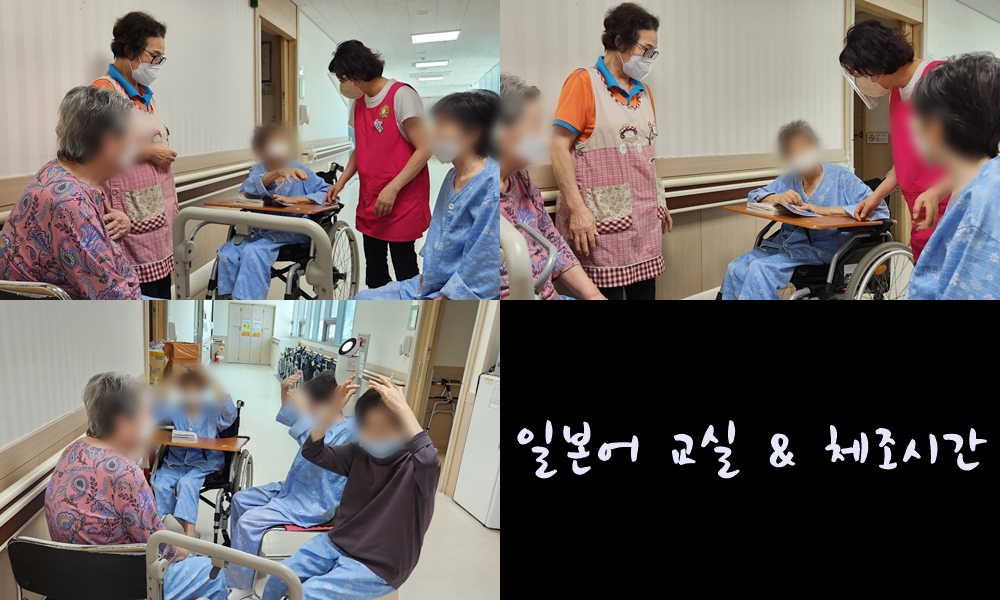 병동갤러리3 본문 오늘 2병동에서는 병동휴게실에서 일본어가 능숙한 어르신께서 일본어 수업을 하셨습니다.^^ 관심을 보인 어르신들과 요양보호사님이 다같이 모여 일본어 강좌를 들으며 즐거운 시간을 보냈습니다. 마무리로 간단한 체조를 하며 병실에 들어가기 전 스트레칭으로 마무리 하였습니다.