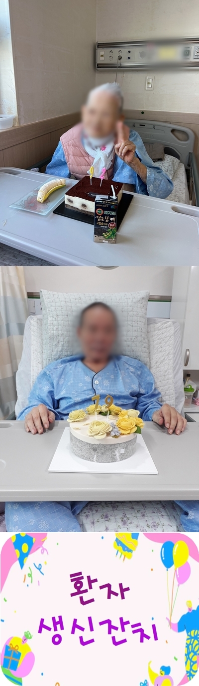 병동갤러리6 본문 저희 영도참편한요양병원에서는 지난 달에 생신이셨던 어르신들과 함께 소소한 생신파티를 하였습니다.보호자분들께서 전해주신 케이크와 함께 사진을 찍어 드렸으며, 생신선물로 찍은 사진을 액자에 담아 드렸습니다.어르신들께서 매우 좋아하셨고, 소소한 생신파티였지만 입가에 미소가 완연하셨습니다. ^^