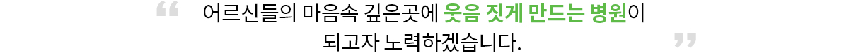 최고의 의료진과 쾌적한 환경, 자식 같은 마음으로 어르신이 편안하게 쉴 수 있는 참편한요양병원이 되고자 노력하겠습니다.