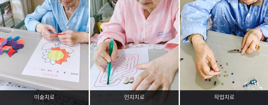 미술치료, 인지치료, 작업치료 등을 통하여 집중력을 향상, 긴장완화 및 심리적 안정감 성취, 소근육과 대근육의 운동기능 활성화, 손과 눈의 협응력 강화, 인지적 기능 유지 및 향상을 시킬 수 있습니다.
