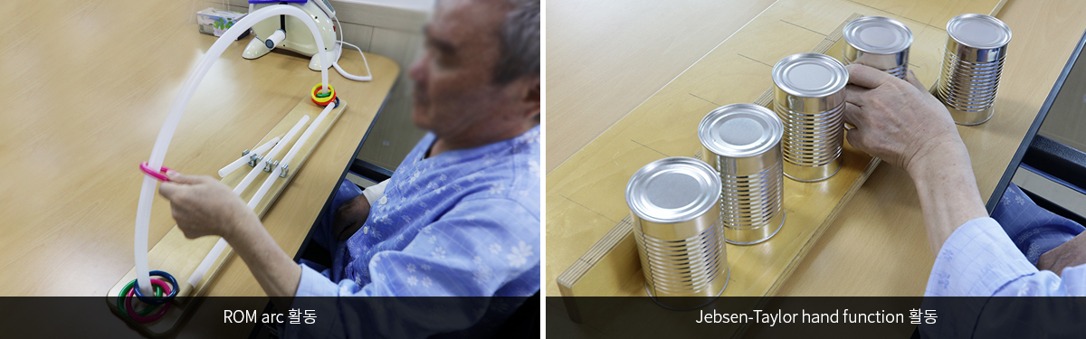 여러 가지 도구나 기계 (손 기능 강화훈련도구, 인지 및 지각훈련도구 시․지각훈련도구 등)을 이용하여 주로 상지의 근력강화, 미세동작훈련, 관절가동범위운동, 감각자극 인지훈련 등의 방법으로 반복된 교육을 해서 정상적 기능을 유도합니다.